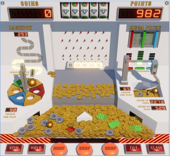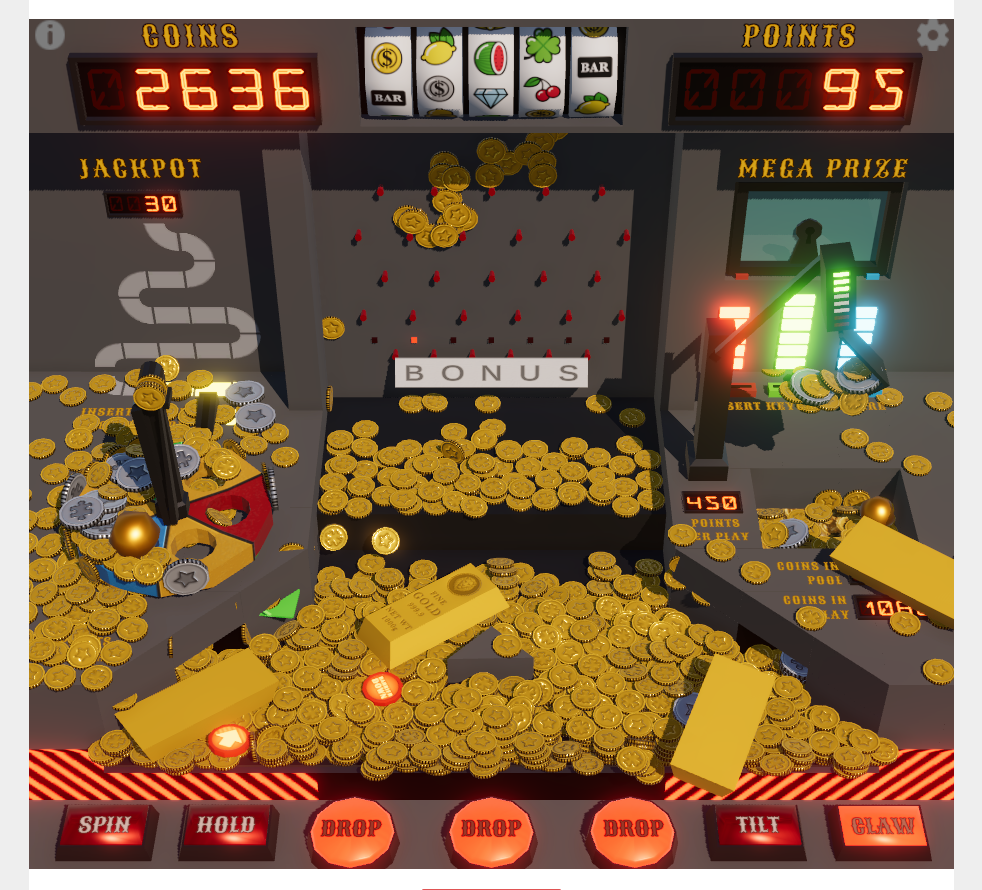 That was fantastic! I think the most satisfying coin pusher I've experienced. Really enjoyed the claw/spin options. The only issue I encountered was the spin ceased to work. Cost is 190 points and I had over about 300, and the "spin" light stayed on, like it was active, but no spinning ever happened. I did create some fantastic coin jams in the backboard and it was really satisfying when they dislodged themselves. Really enjoyable and the mini games really took it up a level.