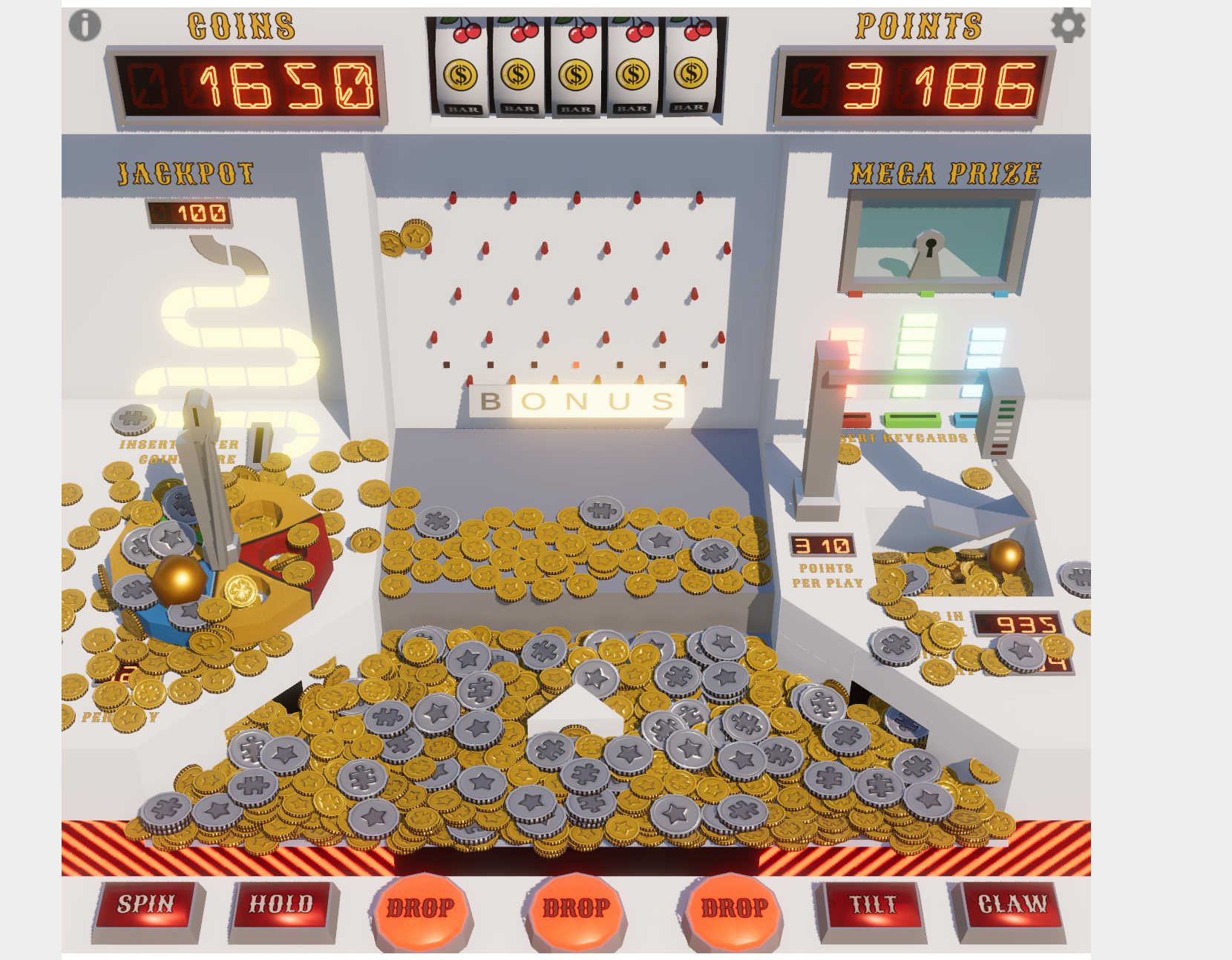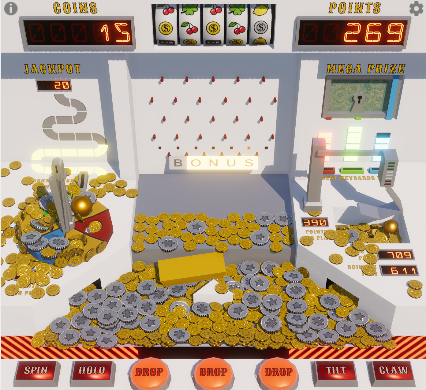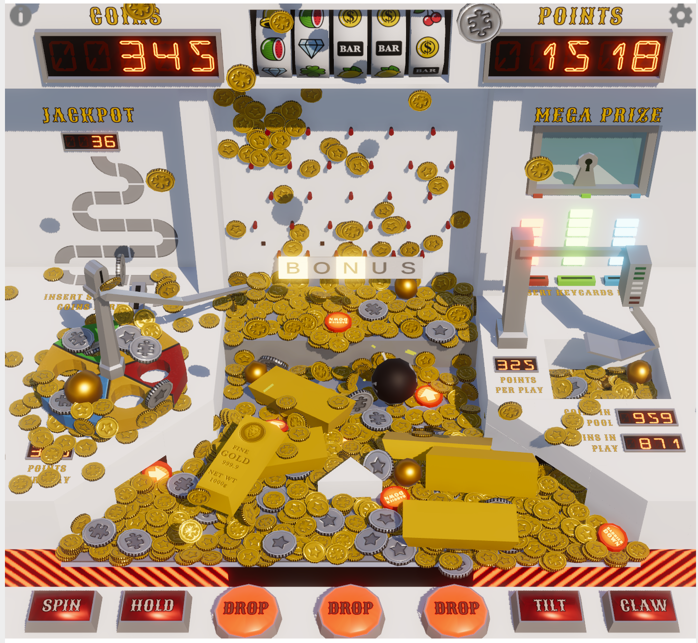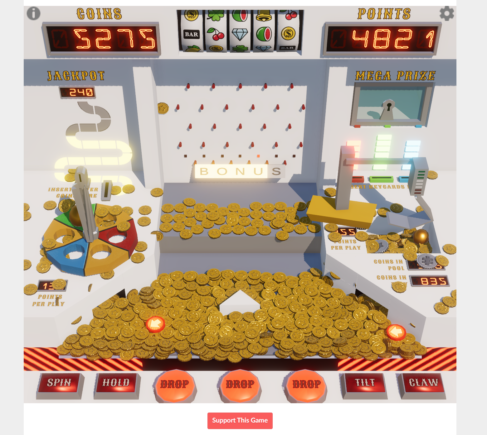 Good stuff had a blast. Would love to see a stripped down version that mimics the real life arcade game, no minigames or additional mechanics. Instead of a plinko style coin drop, a wide slot at the top to choose coin drop location. Would have something like this running in the background permanently just for the fun occasional coin falling sound - true lofi vibes. Thanks for sharing!